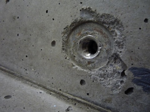 Once the casting is complete you will need to unscrew the hex bolts from the outside of the form. Then you can disassemble the form and extract the casting. Concrete shrinks a bit as it cures. The washer on the inside of the form insures that the coupling nut assembly is below the surface of the concrete. The washer has been knocked free in the picture below with the help of a nail set and a hammer. If you did not use the washer on the inside you would likely need to grind the head of the coupling nut flush. This trick saves a step.