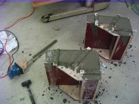 Once the form is at capacity it is hammer time again. It is now too full to be pushed and thumped like you were doing before. There are a number of different ways to get the remaining air out. Some people use a table with an inline air sander mounted to it. This ‘vibrating’ table does a lot of the work. Other people use some sort of vibrating wand to slip into the concrete and vibrate the air out from the inside. A simple shop built version is pictured below made from an old 1/4 sheet sander.